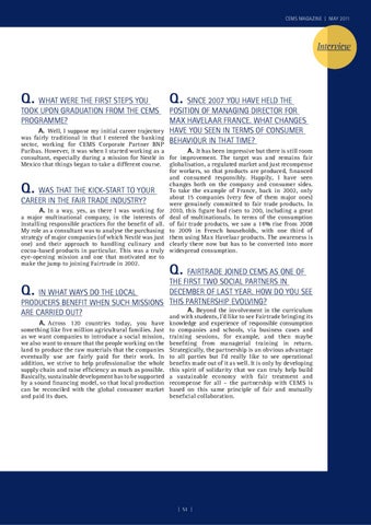A. Well, I suppose my initial career trajectory was fairly traditional in that I entered the banking sector, working for CEMS Corporate Partner BNP Paribas. However, it was when I started working as a A. It has been impressive but there is still room consultant, especially during a mission for Nestlé in for improvement. The target was and remains fair Mexico that things began to take a different course. globalisation, a regulated market and just recompense for workers, so that products are produced, financed and consumed responsibly. Happily, I have seen changes both on the company and consumer sides. To take the example of France, back in 2002, only Was that the kick-start to your about 15 companies (very few of them major ones) career in the fair trade industry? were genuinely committed to fair trade products. In A. In a way, yes, as there I was working for 2010, this figure had risen to 200, including a great a major multinational company, in the interests of deal of multinationals. In terms of the consumption installing responsible practices for the benefit of all. of fair trade products, we saw a 14% rise from 2008 My role as a consultant was to analyse the purchasing to 2009 in French households, with one third of strategy of major companies (of which Nestlé was just them using Max Havelaar products. The awareness is one) and their approach to handling culinary and clearly there now but has to be converted into more cocoa-based products in particular. This was a truly widespread consumption. eye-opening mission and one that motivated me to make the jump to joining Fairtrade in 2002.