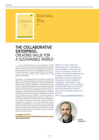 The Collaborative Enterprise: Creating Value for a Sustainable World As an output of the joint research project of the CSR Unit of Bocconi University Milan and the Business Ethics Center of Cor vinus University of Budapest a new book has been published under the title The Collaborative Enterprise: Creating Values for a Sustainable World edited by Antonio Tencati and Laszlo Zsolnai, 2010. Oxford, Peter Lang Academic Publishers. The authors - including professors from Bocconi University Milan, NHH Nor wegian School of Economics and Business Administration Bergen, Rotterdam School of Management and Corvinus University of Budapest - argue that the current pattern of global development is unsustainable especially because of the detrimental social and environmental effects of the prevailing mainstream business model. A change of paradigm is needed. Business should respect the ecological and social limits in which it operates and embed its activities in the natural and social systems. The book promotes a collaborative way of doing business, based on a positive view of the self and others. It collects theoretical contributions, case studies and business initiatives, which show that a collaborative enterprise is not only possible but also a feasible and desirable alternative to the current managerial models. Enterprises seeking to build long-lasting, mutually beneficial relationships with all their constituencies, while producing values for their stakeholder networks, represent hopes for a better future.