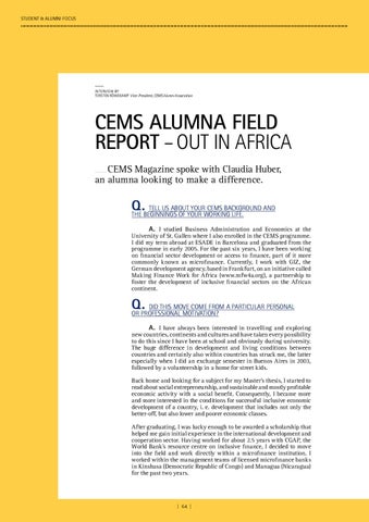 University of St. Gallen where I also enrolled in the CEMS programme. I did my term abroad at ESADE in Barcelona and graduated from the programme in early 2005. For the past six years, I have been working on financial sector development or access to finance, part of it more commonly known as microfinance. Currently, I work with GIZ, the German development agency, based in Frankfurt, on an initiative called Making Finance Work for Africa (www.mfw4a.org), a partnership to foster the development of inclusive financial sectors on the African continent.