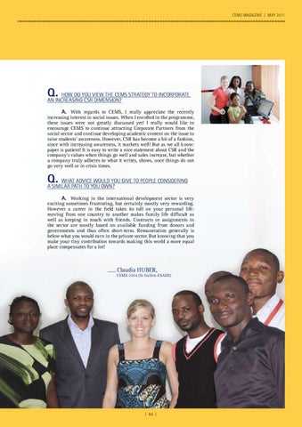 increasing interest in social issues. When I enrolled in the programme, these issues were not greatly discussed yet! I really would like to encourage CEMS to continue attracting Corporate Partners from the social sector and continue developing academic content on the issue to raise students' awareness. However, CSR has become a bit of a fashion, since with increasing awareness, it markets well! But as we all know: paper is patient! It is easy to write a nice statement about CSR and the company's values when things go well and sales increase, but whether a company truly adheres to what it writes, shows, once things do not go very well or in crisis times.