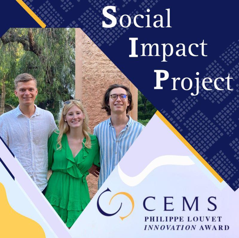 The Social Impact Project won the CEMS Philippe Louvet Innovation Award 2022. Three CEMS students from ESADE Business School and Corvinus University of Budapest aimed to create an opportunity for changemakers to act together and tackle global challenges through three pillars:
