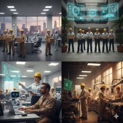 "Representaunaimagena trabajadoresmexicanos,divididaenun layoutde4imágenes,representando lasetapas;desplazamiento, incertidumbre,capacitacióny adaptación,mostrandosuevolución conlaIA."