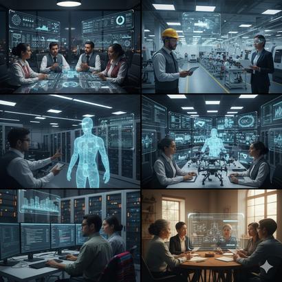 "Representaenunaimagentrabajadores mexicanos,divididaenunlayoutde4 imagenes,representandolosdistintos empleosoáreasdegestión,supervisioón, implementaciónyeticadelaIAendondese muestrecomoseimplementalaIAenesas etapas"