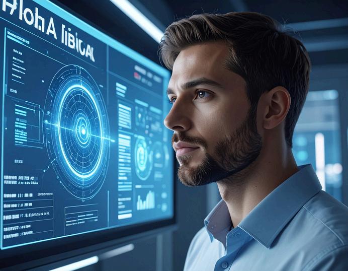 "Representaenunaimagenaunanalista supervisandoalainteligenciaartificial mientrasestatomadecisionesytrabaja.La personaesunhombreadultojoven,detez clara,conbarbacortayvistiendocamisa formal Semuestraatento,conuna expresiónseriayreflexiva,observandouna interfazfuturistaenunagranpantalla dondelaIAprocesadatos.