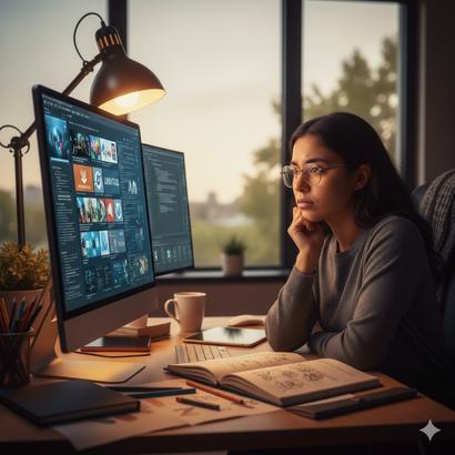 "Representaenunaimagendondese encuentreunadiseñadorapreocupada frenteasucomputador,mientrasobserva comolaIAgeneradiseños automáticamente,característicasfísicas: mujerjoven,detezmorenaylentes."
