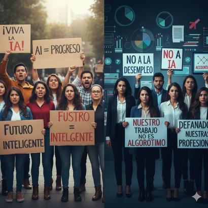 "Representaenunaimagendosgrupos,del ladoizquierdoesténpersonasadultas mexicanasmolestasafavordelaInteligencia Artificialydelladoderechoprofesionistasen contradelainteligenciaartificial,diseñadores gráficosycontadores."