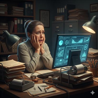"Representaunaimagendeunamujerde medianaedad,tezmorenaclaraycabello recogido,sentadafrenteauna computadora.Suexpresiónesdemiedoe inseguridadmientrasenlapantalla aparecedatosactualizadosdesutrabajo Asualrededorhaydocumentosy herramientastradicionalesdetrabajo, representandolafaltadehabilidades tecnológicas."
