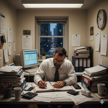 "Representaunaimagendondeseencuentre uncontadorestresadorealizandocálculosde maneramanualenunapequeñaoficina, característicasfísicas:hombredebarbacorta ypelocortotezmorenaylentes."