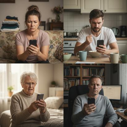 "Representaenunaimagenapersonas adultascotidianasdesdesucasa, divididasenunlayoutde4imágenes, todasmostrandounrostroindiferente hastaenojadomientrasvenunteléfono"