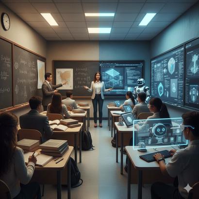 "Representaenunaimagendeunaula divididaendos,elladoizquierdoalumnos mexicanosenunaulaconpizarronesy librosydelladoderechounaulacon pantallasdigitalesyrobots,representando elimpactodelaIAenlaeducación"