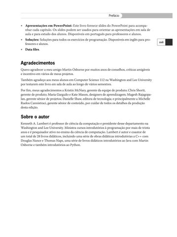 Agradecimentos Quero agradecer a meu amigo Martin Osborne por muitos anos de conselhos, críticas amigáveis e incentivo em vários de meus projetos. Também agradeço aos meus alunos em Computer Science 112 na Washington and Lee University por testarem este livro em sala de aula ao longo de vários semestres. Por fim, meus agradecimentos a Kristin McNary, gerente da equipe de produto; Chris Shortt, gerente de produto; Maria Garguilo e Kate Mason, designers de aprendizagem; Magesh Rajagopalan, gerente sênior de projetos; Danielle Shaw, editora de tecnologia; e principalmente a Michelle Ruelos Cannistraci, gerente sênior de conteúdo, por cuidar de todos os detalhes da produção desta edição.