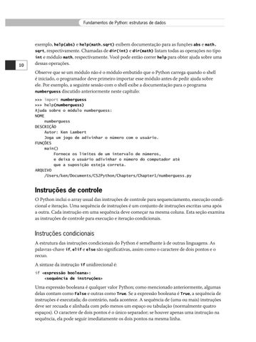 Instruções de controle O Python inclui o array usual das instruções de controle para sequenciamento, execução condicional e iteração. Uma sequência de instruções é um conjunto de instruções escritas uma após a outra. Cada instrução em uma sequência deve começar na mesma coluna. Esta seção examina as instruções de controle para execução e iteração condicionais.