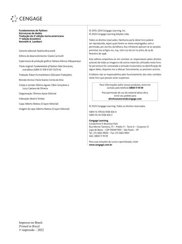 Gerente editorial: Noelma Brocanelli Editora de desenvolvimento: Gisela Carnicelli Supervisora de produção gráfica: Fabiana Alencar Albuquerque Título original: Fundamentals of Python: Data Structures, 2nd edition (ISBN 13: 978-0-357-12275-4) Tradução: Edson Furmankiewicz (Docware Traduções) Revisão técnica: Flavio Soares Correa da Silva Cotejo e revisão: Mônica Aguiar, Fábio Gonçalves e Luicy Caetano de Oliveira Diagramação: 3Pontos Apoio Editorial Indexação: Beatriz Simões Capa: Alberto Mateus (Crayon Editorial) Imagem da capa: Alberto Mateus (Crayon Editorial)