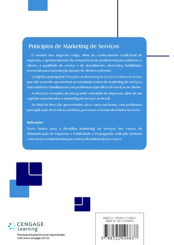 Princípios de Marketing de Serviços O mundo dos negócios exige, além do conhecimento tradicional de negócios, o aprimoramento da competência do profissional para satisfazer o cliente, a qualidade do serviço e do atendimento oferecidos, habilidades essenciais para sustentação da base de clientes existente. O objetivo principal de Princípios de Marketing de Serviços é oferecer textos que não somente apresentem ao estudante a área de marketing de serviços, mas também o familiarizem com problemas específicos de serviços ao cliente. A obra traz exemplos de uma grande variedade de empresas, além de um capítulo especial sobre o marketing de serviços no Brasil. Ao final do livro são apresentados doze casos nacionais, com problemas para aplicação de técnicas, modelos, processos e teorias abordados no texto. Aplicações Texto básico para a disciplina marketing de serviços dos cursos de Administração de Empresas e Publicidade e Propaganda. Indicado também como texto complementar para outras disciplinas desses cursos.