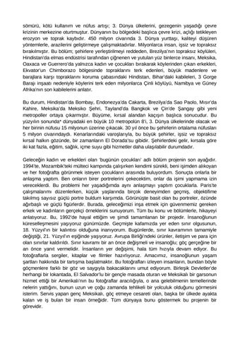 sömürü, kötü kullanım ve nüfus artışı; 3. Dünya ülkelerini, gezegenin yaşadığı çevre krizinin merkezine oturtmuştur. Dünyanın bu bölgedeki başlıca çevre krizi, açlığı tetikleyen erozyon ve toprak kaybıdır. 450 milyon civarında 3. Dünya yurttaşı, kaliteyi düşüren yöntemlerle, arazilerini geliştirmeye çalışmaktadırlar. Milyonlarca insan, işsiz ve topraksız bırakılmıştır. Bu bölüm; şehirlere yerleştirilmeyi reddeden, Brezilya’nın topraksız köylüleri, Hindistan’da elmas endüstrisi tarafından çiğnenen ve yutulan yüz binlerce insanı, Meksika, Oaxaca ve Guerrero’da yalnızca kadın ve çocukları bırakarak köylerinden çıkan erkekleri, Ekvator’un Chimborazo bölgesinde topraklarını terk edenleri, büyük madenlere ve barajlara karşı topraklarını koruma çabasındaki Hindistan, Bihar’daki kabileleri, 3 Gorge Barajı inşaatı nedeniyle köylerini terk eden milyonlarca Çinli köylüyü, Namibya ve Güney Afrika’nın son kabilelerini anlatır. Bu durum, Hindistan’da Bombay, Endonezya’da Cakarta, Brezilya’da Sao Paolo, Mısır’da Kahire, Meksika’da Meksiko Şehri, Tayland’da Bangkok ve Çin’de Şangay gibi yeni metropoller ortaya çıkarmıştır. Büyüme, kırsal alandan kaçışın başlıca sonucudur. Bu yüzyılın sonunda* dünyadaki en büyük 10 metropolün 8’i, 3. Dünya ülkelerinde olacak ve her birinin nüfusu 15 milyonun üzerine çıkacak. 30 yıl önce bu şehirlerin ortalama nüfusları 5 milyon civarındaydı. Kenarlarındaki varoşlarıyla, bu büyük şehirler, işsiz ve topraksız kırsal halkın gözünde, bir zamanların El Dorada’su gibidir. Şehirlerdeki gelir, kırsala göre iki kat fazla, eğitim, sağlık, içme suyu gibi hizmetler daha ulaşılabilir durumdadır. Geleceğin kadın ve erkekleri olan ‘bugünün çocukları’ adlı bölüm projenin son ayağıdır. 1994’te, Mozambik’teki mülteci kampında çalışırken kendimi sürekli, beni işimden alıkoyan ve her fotoğrafta görünmek isteyen çocukların arasında buluyordum. Sonuçta onlarla bir anlaşma yaptım. Ben onların birer portrelerini çekecektim, onlar da işimi yapmama izin vereceklerdi. Bu problemi her yaşadığımda aynı anlaşmayı yaptım çocuklarla. Paris’te çalışmalarımı düzenlerken, küçük yaşlarında birçok deneyimden geçmiş, objektifime takılmış sayısız güçlü portre buldum karşımda. Görünüşte basit olan bu portreler, özünde ağırbaşlı ve güçlü figürlerdir. Burada, geleceğimizi inşa etmek için güvenmemiz gereken erkek ve kadınların gerçekçi örneklerini sunuyorum. Tüm bu konu ve bölümlerle, hikayeyi anlatıyoruz. Bu, 1992’de hayal ettiğim ve şimdi tamamlanan bir projedir. İnsanoğlunun küreselleşmesini yaşıyoruz günümüzde. Geçmişte kafamızda yer eden sınır olgusunun, 18. Yüzyıl’ın bir kalıntısı olduğuna inanıyorum. Bugünlerde, sınır kavramının tamamiyle değiştiği, 21. Yüzyıl’ın eşiğinde yaşıyoruz. Avrupa Birliği’ndeki ürünler, iletişim ve para için olan sınırlar kaldırıldı. Sınır kavramı bir an önce değişmeli ve insanoğlu; göç gerçeğine bir an önce yanıt vermelidir. İnsanların yer değişimi, hala tüm hızıyla devam ediyor. Bu fotoğraflarla sergiler, kitaplar ve filmler hazırlıyoruz. Amacımız, insanoğlunun yaşam şartları hakkında bir tartışma başlatmaktır. Bu fotoğrafları izleyen insanların, bundan böyle göçmenlere farklı bir göz ve saygıyla bakacaklarını umut ediyorum. Birleşik Devletler’de herhangi bir lokantada, El Salvador’lu bir gençle masada oturan ve Meksikalı bir garsonun hizmet ettiği bir Amerikalı’nın bu fotoğraflar aracılığıyla, o ana gelebilmenin temellerinde nelerin yattığını, bunun uzun ve çoğu zamanda tehlikeli bir yolculuk olduğunu görmesini isterim. Servis yapan genç Meksikalı, göç etmeye cesareti olan, başka bir ülkede ayakta kalan ve iş bulan bir insan örneğidir. Tüm dünyaya bunu göstermek bu projenin bir görevidir.