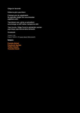 Gölge bir fanzindir. Kafasına göre yayımlanır. Fotokopi yolu ile çoğaltılabilir. Bu işlemden doğan tüm sorumluluklar çoğaltana aittir. Yayımlanan yazı, görüş ve görsellerin sorumluluğu ve telif hakları sahiplerine aittir. Yayın kurulu, Gölge Fanzin’e gönderilen yazıları yayımlayıp yayımlamamakta serbesttir. Ücretsizdir. Tasarım: I.İ.K Kapak Tasarımı: © Cenk 'Mirat' PEKCANATTI