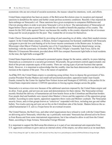 economists who are not critical of socialist economies, the masses valued his intentions, work, and efforts. United States imperialism has been an enemy of the Bolivarian Revolution since its inception and imposed sanctions to destabilize the nation and further create perilous economic conditions. Recently it has imposed de facto embargo on Venezuela’s oil. These sanctions have given exemptions to companies Halliburton and Chevron among others in order to privatize Venezuela’s oil in its favor. The nationalization of Venezuelan oil began before Chavez came to power. He invested the oil wealth to benefit the populace of his country. The reason for the 2002 strike against Chavez was because the wealthy in the country objected to the oil revenues being used for social programs for the poor. They wanted the oil revenue for themselves. Under Chavez Venezuela assisted Haiti by providing oil and canceling its oil debts, when Haiti needed extreme support. In the United States empire, in Boston, former Congressman Joe Kennedy established with Venezuela a program to provide low-cost heating oil to his lower-income constituents in the Boston area. In Jackson, Mississippi when Mayor Chokwe Lumumba was a City Councilperson, Venezuela shared energy saving technology with the community. In October 2009, his Ward 2 People’s Assembly Task Force, led by the Malcolm X Grassroots Movement, provided about 4000 free compact fluorescent light bulbs to local residents. At the time, the light bulbs averaged $8.3 United States Imperialism has continued to promoted regime change for the nation, aided by its press labeling Venezuela as a communist or a socialist government. Structurally, the government controls approximately one third of the private corporate equity of the country. There are varying types of private business that operate freely. However, it is important to acknowledge that the wealthy class has been determined to see their profits increase at the expense of the poor. This is the nature of capitalism. As of May 2019, the United States empire is considering using military force to depose the government of Venezuelan President Nicolas Maduro and install self-proclaimed president, opposition leader Juan Guaido. Guaido, trained by the Center for Applied Non-Violent Action and Strategies (CANVAS), is the perfect fit for United States imperialist interest. CANVAS specializes in forcing regime changes across the globe. Venezuela is in serious crisis now because of the additional sanctions imposed by the United States empire and its allies. Food, goods, and services are scare and demonstrations for them intense. The Venezuelan military recently blocked the delivery of humanitarian aid from hostile forces at the Colombian and Brazilian borders. Four people died and hundreds were injured when Maduro’s forces and the supporters of the opposition group clashed. According to some reports, opposition supporters threw rocks and Molotov cocktails. The Venezuelan security forces, and civilian groups known as “colectivos” responded with force, including tear gas and rubber bullets. Two trucks carrying aid were set on fire on the Colombian side of the border. Maduro believes the socalled humanitarian U.S. aid is a Trojan horse for an eventual invasion. The United Nations, the Red Cross, and other relief organizations have refused to work with the United States on delivering aid to Venezuela, which they say is politically motivated. Venezuela has allowed aid to be flown in from Russia and from some international organizations, but it has refused to allow in aid from the United States, according to Jorge Arreaza, Venezuelan Foreign Minister. It is important to support the Bolivarian Revolution as it is part of our international anti-imperialist front. U.S. aggression continues to grow and as an internal colony of the empire, our allies need us as we need them. 3) See “Chavez Brings the Light” by Adam Lynch, 2009, Jackson Free Press, http://www.jacksonfreepress.com/news/2009/oct/26/chavez-brings-the-light