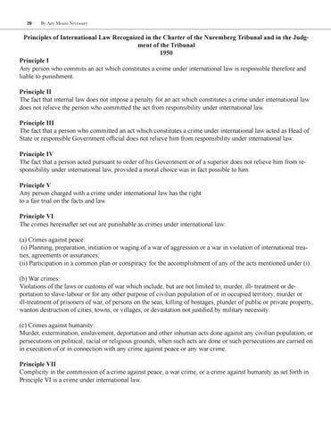 Principles of International Law Recognized in the Charter of the Nuremberg Tribunal and in the Judgment of the Tribunal 1950 Principle I Any person who commits an act which constitutes a crime under international law is responsible therefore and liable to punishment. Principle II The fact that internal law does not impose a penalty for an act which constitutes a crime under international law does not relieve the person who committed the act from responsibility under international law. Principle III The fact that a person who committed an act which constitutes a crime under international law acted as Head of State or responsible Government official does not relieve him from responsibility under international law. Principle IV The fact that a person acted pursuant to order of his Government or of a superior does not relieve him from responsibility under international law, provided a moral choice was in fact possible to him. Principle V Any person charged with a crime under international law has the right to a fair trial on the facts and law. Principle VI The crimes hereinafter set out are punishable as crimes under international law: (a) Crimes against peace: (i) Planning, preparation, initiation or waging of a war of aggression or a war in violation of international treaties, agreements or assurances; (ii) Participation in a common plan or conspiracy for the accomplishment of any of the acts mentioned under (i). (b) War crimes: Violations of the laws or customs of war which include, but are not limited to, murder, ill- treatment or deportation to slave-labour or for any other purpose of civilian population of or in occupied territory, murder or ill-treatment of prisoners of war, of persons on the seas, killing of hostages, plunder of public or private property, wanton destruction of cities, towns, or villages, or devastation not justified by military necessity. (c) Crimes against humanity: Murder, extermination, enslavement, deportation and other inhuman acts done against any civilian population, or persecutions on political, racial or religious grounds, when such acts are done or such persecutions are carried on in execution of or in connection with any crime against peace or any war crime. Principle VII Complicity in the commission of a crime against peace, a war crime, or a crime against humanity as set forth in Principle VI is a crime under international law.