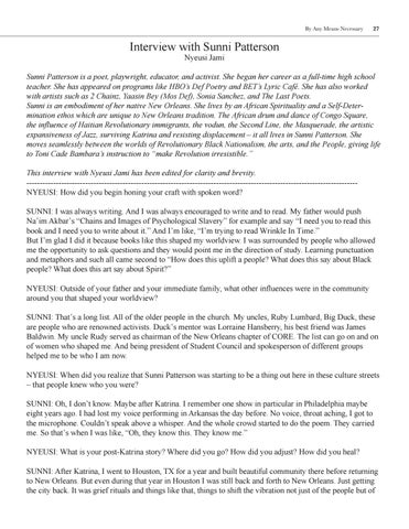 Sunni Patterson is a poet, playwright, educator, and activist. She began her career as a full-time high school teacher. She has appeared on programs like HBO’s Def Poetry and BET’s Lyric Café. She has also worked with artists such as 2 Chainz, Yaasin Bey (Mos Def), Sonia Sanchez, and The Last Poets. Sunni is an embodiment of her native New Orleans. She lives by an African Spirituality and a Self-Determination ethos which are unique to New Orleans tradition. The African drum and dance of Congo Square, the influence of Haitian Revolutionary immigrants, the vodun, the Second Line, the Masquerade, the artistic expansiveness of Jazz, surviving Katrina and resisting displacement – it all lives in Sunni Patterson. She moves seamlessly between the worlds of Revolutionary Black Nationalism, the arts, and the People, giving life to Toni Cade Bambara’s instruction to “make Revolution irresistible.” This interview with Nyeusi Jami has been edited for clarity and brevity. ---------------------------------------------------------------------------------------------------------------------------NYEUSI: How did you begin honing your craft with spoken word? SUNNI: I was always writing. And I was always encouraged to write and to read. My father would push Na’im Akbar’s “Chains and Images of Psychological Slavery” for example and say “I need you to read this book and I need you to write about it.” And I’m like, “I’m trying to read Wrinkle In Time.” But I’m glad I did it because books like this shaped my worldview. I was surrounded by people who allowed me the opportunity to ask questions and they would point me in the direction of study. Learning punctuation and metaphors and such all came second to “How does this uplift a people? What does this say about Black people? What does this art say about Spirit?” NYEUSI: Outside of your father and your immediate family, what other influences were in the community around you that shaped your worldview? SUNNI: That’s a long list. All of the older people in the church. My uncles, Ruby Lumbard, Big Duck, these are people who are renowned activists. Duck’s mentor was Lorraine Hansberry, his best friend was James Baldwin. My uncle Rudy served as chairman of the New Orleans chapter of CORE. The list can go on and on of women who shaped me. And being president of Student Council and spokesperson of different groups helped me to be who I am now. NYEUSI: When did you realize that Sunni Patterson was starting to be a thing out here in these culture streets – that people knew who you were? SUNNI: Oh, I don’t know. Maybe after Katrina. I remember one show in particular in Philadelphia maybe eight years ago. I had lost my voice performing in Arkansas the day before. No voice, throat aching, I got to the microphone. Couldn’t speak above a whisper. And the whole crowd started to do the poem. They carried me. So that’s when I was like, “Oh, they know this. They know me.” NYEUSI: What is your post-Katrina story? Where did you go? How did you adjust? How did you heal? SUNNI: After Katrina, I went to Houston, TX for a year and built beautiful community there before returning to New Orleans. But even during that year in Houston I was still back and forth to New Orleans. Just getting the city back. It was grief rituals and things like that, things to shift the vibration not just of the people but of