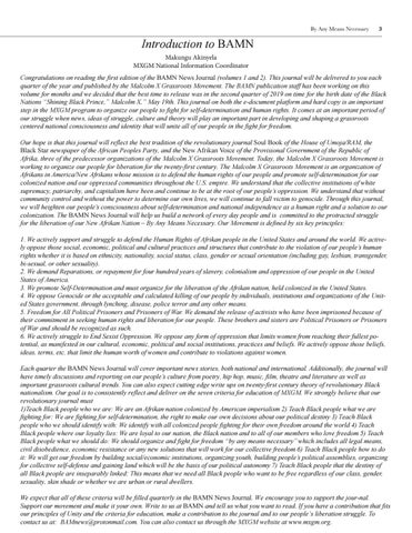 Introduction to BAMN Makungu Akinyela MXGM National Information Coordinator Congratulations on reading the first edition of the BAMN News Journal (volumes 1 and 2). This journal will be delivered to you each quarter of the year and published by the Malcolm X Grassroots Movement. The BAMN publication staff has been working on this volume for months and we decided that the best time to release was in the second quarter of 2019 on time for the birth date of the Black Nations “Shining Black Prince,” Malcolm X,” May 19th. This journal on both the e-document platform and hard copy is an important step in the MXGM program to organize our people to fight for self-determination and human rights. It comes at an important period of our struggle when news, ideas of struggle, culture and theory will play an important part in developing and shaping a grassroots centered national consciousness and identity that will unite all of our people in the fight for freedom. Our hope is that this journal will reflect the best tradition of the revolutionary journal Soul Book of the House of Umoja/RAM, the Black Star newspaper of the African Peoples Party, and the New Afrikan Voice of the Provisional Government of the Republic of Afrika, three of the predecessor organizations of the Malcolm X Grassroots Movement. Today, the Malcolm X Grassroots Movement is working to organize our people for liberation for the twenty-first century. The Malcolm X Grassroots Movement is an organization of Afrikans in America/New Afrikans whose mission is to defend the human rights of our people and promote self-determination for our colonized nation and our oppressed communities throughout the U.S. empire. We understand that the collective institutions of white supremacy, patriarchy, and capitalism have been and continue to be at the root of our people’s oppression. We understand that without community control and without the power to determine our own lives, we will continue to fall victim to genocide. Through this journal, we will heighten our people’s consciousness about self-determination and national independence as a human right and a solution to our colonization. The BAMN News Journal will help us build a network of every day people and is committed to the protracted struggle for the liberation of our New Afrikan Nation – By Any Means Necessary. Our Movement is defined by six key principles: 1. We actively support and struggle to defend the Human Rights of Afrikan people in the United States and around the world. We actively oppose those social, economic, political and cultural practices and structures that contribute to the violation of our people’s human rights whether it is based on ethnicity, nationality, social status, class, gender or sexual orientation (including gay, lesbian, transgender, bi-sexual, or other sexuality). 2. We demand Reparations, or repayment for four hundred years of slavery, colonialism and oppression of our people in the United States of America. 3. We promote Self-Determination and must organize for the liberation of the Afrikan nation, held colonized in the United States. 4. We oppose Genocide or the acceptable and calculated killing of our people by individuals, institutions and organizations of the United States government, through lynching, disease, police terror and any other means. 5. Freedom for All Political Prisoners and Prisoners of War. We demand the release of activists who have been imprisoned because of their commitment in seeking human rights and liberation for our people. These brothers and sisters are Political Prisoners or Prisoners of War and should be recognized as such. 6. We actively struggle to End Sexist Oppression. We oppose any form of oppression that limits women from reaching their fullest potential, as manifested in our cultural, economic, political and social institutions, practices and beliefs. We actively oppose those beliefs, ideas, terms, etc. that limit the human worth of women and contribute to violations against women. Each quarter the BAMN News Journal will cover important news stories, both national and international. Additionally, the journal will have timely discussions and reporting on our people’s culture from poetry, hip hop, music, film, theatre and literature as well as important grassroots cultural trends. You can also expect cutting edge write ups on twenty-first century theory of revolutionary Black nationalism. Our goal is to consistently reflect and deliver on the seven criteria for education of MXGM. We strongly believe that our revolutionary journal must 1)Teach Black people who we are: We are an Afrikan nation colonized by American imperialism 2) Teach Black people what we are fighting for: We are fighting for self-determination, the right to make our own decisions about our political destiny 3) Teach Black people who we should identify with: We identify with all colonized people fighting for their own freedom around the world 4) Teach Black people where our loyalty lies: We are loyal to our nation, the Black nation and to all of our members who love freedom 5) Teach Black people what we should do: We should organize and fight for freedom “by any means necessary” which includes all legal means, civil disobedience, economic resistance or any new solutions that will work for our collective freedom 6) Teach Black people how to do it: We will get our freedom by building social/economic institutions, organizing youth, building people’s political assemblies, organizing for collective self-defense and gaining land which will be the basis of our political autonomy 7) Teach Black people that the destiny of all Black people are inseparably linked: This means that we need all Black people who want to be free regardless of our class, gender, sexuality, skin shade or whether we are urban or rural dwellers. We expect that all of these criteria will be filled quarterly in the BAMN News Journal. We encourage you to support the jour-nal. Sup