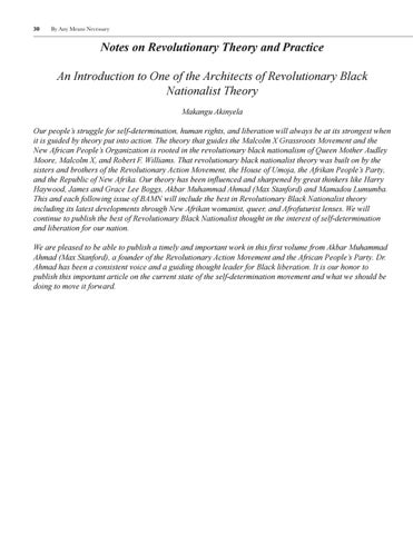 Notes on Revolutionary Theory and Practice An Introduction to One of the Architects of Revolutionary Black Nationalist Theory Makangu Akinyela Our people’s struggle for self-determination, human rights, and liberation will always be at its strongest when it is guided by theory put into action. The theory that guides the Malcolm X Grassroots Movement and the New African People’s Organization is rooted in the revolutionary black nationalism of Queen Mother Audley Moore, Malcolm X, and Robert F. Williams. That revolutionary black nationalist theory was built on by the sisters and brothers of the Revolutionary Action Movement, the House of Umoja, the Afrikan People’s Party, and the Republic of New Afrika. Our theory has been influenced and sharpened by great thinkers like Harry Haywood, James and Grace Lee Boggs, Akbar Muhammad Ahmad (Max Stanford) and Mamadou Lumumba. This and each following issue of BAMN will include the best in Revolutionary Black Nationalist theory including its latest developments through New Afrikan womanist, queer, and Afrofuturist lenses. We will continue to publish the best of Revolutionary Black Nationalist thought in the interest of self-determination and liberation for our nation. We are pleased to be able to publish a timely and important work in this first volume from Akbar Muhammad Ahmad (Max Stanford), a founder of the Revolutionary Action Movement and the African People’s Party. Dr. Ahmad has been a consistent voice and a guiding thought leader for Black liberation. It is our honor to publish this important article on the current state of the self-determination movement and what we should be doing to move it forward.