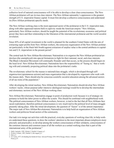 collective level of national consciousness will it be able to develop a clear class-consciousness. The New Afrikan proletariat will see its true class interest. The New Afrikan nationality’s oppression is the greatest strength of U.S. imperialist finance capital. It must first develop a collective consciousness and understand its (New Afrikan proletariat) specific needs. The New Afrikan working class is the most oppressed sector of the proletariat in the U.S. imperialist state, along with other oppressed nations held in captivity inside the American empire.1 New Afrikans, particularly New Afrikan workers, should be taught the potential of the revolutionary economic and political power they have and their relationship to the liberation of the international proletariat and the world socialist revolution. Since 40% of all capital investment in the world is planned for the southern United States with the aim of extracting super-profits from New Afrikan workers, the conscious organization of the New Afrikan proletariat (particularly in the black belt South) against extraction of surplus value is the central antithesis to capitalism and U.S. imperialism in the present period.2 The central task for New Afrikan Revolutionary Nationalists is to organize the New Afrikan proletariat/underclass (the unemployed) into special formations to fight for their national, racial, and class interests. The Black Liberation Movement will continually flounder until that occurs, so the process should begin on the local level. New Afrikan Revolutionary Nationalists have the responsibility of “fusing in,” that is working with and constantly projecting political ideas into the proletariat’s ranks. The revolutionary school for the masses is national/class struggle, which is developed through selforganiza-tion (spontaneous actions) and mass organization that is developed by organizers who work with the masses daily. There should also be conscious scientific socialist education among the advanced sectors of all sec-tions of the population.3 After developing the initial nucleus, New Afrikan Revolutionary Nationalists should develop New Afrikan workers’ nuclei, whose purpose (after intensive ideological training) would be to develop the intermediate and elementary sections of the New Afrikan working class. New Afrikan Revolutionary Nationalists engage in point of production work because it is of strategic importance to build the labor power to affect the system. This should be combined with neighborhood work. The political consciousness of New Afrikan workers, however, is tied to the fact that all New Afrikans face racial exploitation, therefore political consciousness is very much tied to the political level of mass struggle presently taking place. After the initial development, the question of “fusion” is of the utmost importance. The major task of New Afrikan Revolutionary Nationalists is to help build an organization of New Afrikan workers and politicize broad sectors of the community. Our task is to merge our activities with the practical, everyday questions of working class life, to help workers understand these questions, to draw the workers’ attention to the most important abuses (employers more precisely and practically), to develop among the workers consciousness of their solidarity, consciousness of the common interests and common cause of all the workers as a united working class that is part of the international army of the proletariat.4 1. 2. 3. 4.