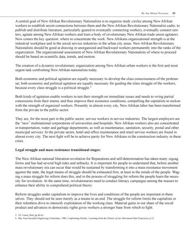 A central goal of New Afrikan Revolutionary Nationalists is to organize study circles among New Afrikan workers to establish secret connections between them and the New Afrikan Revolutionary Nationalist cadre; to publish and distribute literature, particularly geared to eventually connecting workers, eventually connect centers; agitate among New Afrikan workers and train a body of revolutionary New Afrikan trade union agitators. Now comes the key question: where to concentrate the work. New Afrikans organizational strength is at the industrial workplace and in the social service industries in the urban city areas. New Afrikan Revolutionary Nationalists should be good at drawing in unorganized and backward workers permanently into the ranks of the organization. The organizational assessment of New Afrikan Revolutionary Nationalists of where to proceed should be based on scientific data, trends, and motion. The creation of a dynamic revolutionary organization among New Afrikan urban workers is the first and most urgent task confronting New Afrikan nationalists today. Both economic and political agitation are equally necessary to develop the class consciousness of the proletariat; both economic and political agitation are equally necessary for guiding the class struggle of the workers, because every class struggle is a political struggle.5 Both kinds of agitation enable workers to test their strength on immediate issues and needs to wring partial concessions from their enemy and thus improve their economic conditions, compelling the capitalists to reckon with the strength of organized workers. Presently in almost every city, New Afrikan labor has been transformed from the private to the public sector. They are, for the most part in the public sector, service workers in service industries. The largest employers are the “new� multinational corporations of universities and hospitals. New Afrikan workers also are concentrated in transportation, water and garbage departments; as well as maintenance, sanitation, security, postal and other municipal services. In the private sector, hotel and office maintenance and retail service workers are found in almost every city. The next fight will be to achieve parity for New Afrikans in the construction industry in these cities. Legal struggle and mass resistance transitional stages: The New Afrikan national liberation revolution for Reparations and self-determination has taken many zigzag forms and has had several high tides and setbacks. It is important for people to understand that, before another mass revolutionary era can occur that would be sustained by transforming it into a mass resistance movement against the state, the legal means of struggle should be exhausted first, at least in the minds of the people. Waging a mass struggle for reform does this, and in the process of struggling for reform the people learn the necessity for revolution. At the same time, revolutionaries need to conduct literacy campaigns among the masses to enhance their ability to comprehend political theory. Reform struggles under capitalism to improve the lives and conditions of the people are important in them selves. They should not be seen merely as a means to an end. The struggle for reform limits the capitalists in their relentless drive to intensify exploitation of the working class. Material gains in our share of the social product and advances in democratic rights gives workers a stronger base from which to fight. 5. V.I. Lenin, Ibid. pp.40-41. 6. Bay Area Socialist Organizing Committee, 1980, Confronting Reality: Learning from the History of our Movement (San Francisco), p.12.