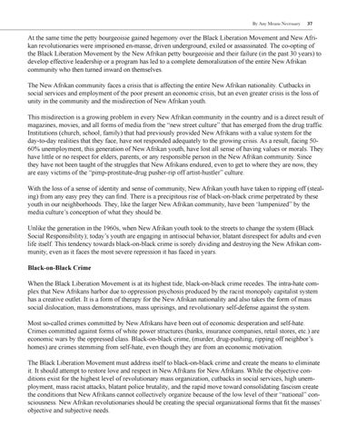 At the same time the petty bourgeoisie gained hegemony over the Black Liberation Movement and New Afrikan revolutionaries were imprisoned en-masse, driven underground, exiled or assassinated. The co-opting of the Black Liberation Movement by the New Afrikan petty bourgeoisie and their failure (in the past 30 years) to develop effective leadership or a program has led to a complete demoralization of the entire New Afrikan community who then turned inward on themselves. The New Afrikan community faces a crisis that is affecting the entire New Afrikan nationality. Cutbacks in social services and employment of the poor present an economic crisis, but an even greater crisis is the loss of unity in the community and the misdirection of New Afrikan youth. This misdirection is a growing problem in every New Afrikan community in the country and is a direct result of magazines, movies, and all forms of media from the “new street culture” that has emerged from the drug traffic. Institutions (church, school, family) that had previously provided New Afrikans with a value system for the day-to-day realities that they face, have not responded adequately to the growing crisis. As a result, facing 5060% unemployment, this generation of New Afrikan youth, have lost all sense of having values or morals. They have little or no respect for elders, parents, or any responsible person in the New Afrikan community. Since they have not been taught of the struggles that New Afrikans endured, even to get to where they are now, they are easy victims of the “pimp-prostitute-drug pusher-rip off artist-hustler” culture. With the loss of a sense of identity and sense of community, New Afrikan youth have taken to ripping off (stealing) from any easy prey they can find. There is a precipitous rise of black-on-black crime perpetrated by these youth in our neighborhoods. They, like the larger New Afrikan community, have been ‘lumpenized” by the media culture’s conception of what they should be. Unlike the generation in the 1960s, when New Afrikan youth took to the streets to change the system (Black Social Responsibility); today’s youth are engaging in antisocial behavior, blatant disrespect for adults and even life itself. This tendency towards black-on-black crime is sorely dividing and destroying the New Afrikan community, even as it faces the most severe repression it has faced in years. Black-on-Black Crime When the Black Liberation Movement is at its highest tide, black-on-black crime recedes. The intra-hate complex that New Afrikans harbor due to oppression psychosis produced by the racist monopoly capitalist system has a creative outlet. It is a form of therapy for the New Afrikan nationality and also takes the form of mass social dislocation, mass demonstrations, mass uprisings, and revolutionary self-defense against the system. Most so-called crimes committed by New Afrikans have been out of economic desperation and self-hate. Crimes committed against forms of white power structures (banks, insurance companies, retail stores, etc.) are economic wars by the oppressed class. Black-on-black crime, (murder, drug-pushing, ripping off neighbor’s homes) are crimes stemming from self-hate, even though they are from an economic motivation. The Black Liberation Movement must address itself to black-on-black crime and create the means to eliminate it. It should attempt to restore love and respect in New Afrikans for New Afrikans. While the objective conditions exist for the highest level of revolutionary mass organization, cutbacks in social services, high unemployment, mass racist attacks, blatant police brutality, and the rapid move toward consolidating fascism create the conditions that New Afrikans cannot collectively organize because of the low level of their “national” consciousness. New Afrikan revolutionaries should be creating the special organizational forms that fit the masses’ objective and subjective needs.