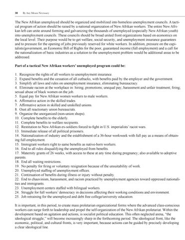 The New Afrikan unemployed should be organized and mobilized into homeless unemployment councils. A tactical program of action should be raised by a national organization of New Afrikan workers. The entire New Afrikan left can unite around forming and galvanizing the thousands of unemployed (especially New Afrikan youth) into unemployment councils. These councils should be broad united front organizations based on economics on the local level. Their purpose would be to get welfare, social security, and unemployment insurance guarantees and to pressure for the opening of jobs previously reserved for white workers. In addition, pressure on the capitalists/government, an Economic Bill of Rights for the poor, guaranteed income (full employment) and a call for the nationalization of basic industries as a solution to the unemployment problem would be additional areas to be addressed. Part of a tactical New Afrikan workers’ unemployed program could be: 1. Recognize the rights of all workers to unemployment insurance. 2. Expand benefits and the cessation of all cutbacks, with benefits paid by the employer and the government. 3. Simplify all laws and rules on unemployment insurance, eliminating bureaucracy. 4. Eliminate racism at the workplace in: hiring; promotions; unequal pay; harassment and unfair treatment; firing; sexual abuse of black women on the job. 5. Equal pay for New Afrikan women workers to male workers. 6. Affirmative action in the skilled trades. 7. Affirmative action in skilled and unskilled unions. 8. Oust all reactionary union bureaucrats. 9. Organize the unorganized (non-union shops). 10. Complete benefits to the elderly. 11. Complete benefits to welfare recipients. 12. Restitution to New Afrikan ex-soldiers forced to fight in U.S. imperialists’ racist wars. 13. Immediate release of all political prisoners. 14. Nationalization of industry and the establishment of a 36-hour workweek with full pay as a means of obtaining full employment. 15. Immigrant workers right to same benefits as native-born workers. 16. End to all rules disqualifying the unemployed from benefits. 17. Maternity grants of 26 weeks, with access to these at any time during pregnancy; also available to adoptive parents. 18. End all waiting restrictions. 19. No penalty for firing or voluntary resignation because of the unsuitability of work. 20. Unemployed staffing of unemployment offices. 21. Continuation of benefits during illness or injury without penalty. 22. End to chauvinism, harassment, and racism practiced by unemployment agencies toward oppressed nationalities and immigrants. 23. Unemployment centers staffed with bilingual workers. 24. Struggle for full workers’ democracy in decisions affecting their working conditions and environment. 25. Job retraining for the unemployed and debt free college/university education. It is important, in this period, to create mass proletarian organizational forms where the advanced class-conscious workers can surge forth to leadership and propel the self-organization of the New Afrikan proletariat. Within the development based on agitation and actions, is socialist political education. This often neglected arena, “the ideological struggle,” will become increasingly sharp in the forthcoming period. The ideological front, like the economic, political, and cultural fronts, is very important, because actions can be guided by precisely developing a clear ideological line.