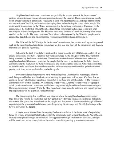 Neighbourhood resistance committees are probably the entities to thank for the success of protests without the convenience of communication through the internet. These committees are mainly youth groups working in community organizing in their own neighbourhoods. At times implementing the instructions of the SPA, and at others disobeying them and enforcing the power of the people. The sit-in was first announced by the SPA as a mass march to the military headquarters. Protestors on the ground under the leadership of neighbourhood resistance committees had decided to stay put after reaching the military headquarters. The SPA then announced the start of the sit-in, but only after it was decided by the people. The mass protests of June 30 were also adopted by the SPA after people on the ground had decided on it and neighbourhood resistance committees began promoting it. The SPA and the DFCF might be the faces of the resistance, but entities working on the ground such as the neighbourhood resistance committees are the soul and body of the movement, and through them the face gains its legitimacy. Following the deal, protests have continued in Sudan’s capital city of Khartoum, and in cit-ies around the country. The July 13 protests that were announced by the SPA prior to the deal, were still being promoted by Resistance committees. The resistance committees of Mamoura and Arkaweet – neighbourhoods in Khartoum – reminded the people that the mass protests planned for July 13 are to commemorate the martyrs of the June 3rd massacre and not to celebrate the deal. While the committees of Bahri issued a newsletter that stated that the deal indicates that the revolution has gained additional points, but it does not mean that it has reached its goals. Even the violence that protestors have been facing since December has not stopped after the deal. Teargas and barbed wire blockades were awaiting the protestors in Khartoum. Confirmed news came out the city of AlSuki of a protestor being shot in the head and killed on July 14. The resistance committees were swifter than the SPA in reacting to the events. After the violent events took place in Alsuki, various resistance committees, within hours, organized vigils and issued statements casting the blame on the military council. While the SPA, many hours later, issued a statement and vaguely pinned the responsibility of the events on “the authorities.” The disappointing deal could lead to a situation where the neighbourhood committees assert their power and remind the leadership that they cannot move forward with decisions that do not satisfy the masses. The power lies in the hands of the people, and that power is demonstrated through efforts of organizing at the grassroots level that can make long-ruling dictatorships and friendly leaderships alike bow to the will of the people. A major lesson learned from the ongoing Sudanese revolution is the importance of organizing based on organic groupings that already exist in the community, such as neighbourhoods. And although in many other places it might be unlikely to face oppression through total Internet blackouts, it might still be worth it to put more emphasis on the real roots while organizing grassroots movements.