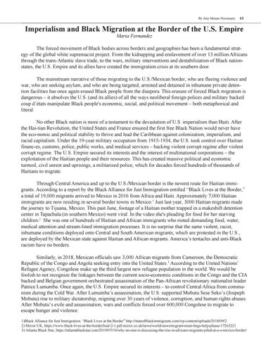 The forced movement of Black bodies across borders and geographies has been a fundamental strategy of the global white supremacist project. From the kidnapping and enslavement of over 13 million Africans through the trans-Atlantic slave trade, to the wars, military interventions and destabilization of Black nationstates, the U.S. Empire and its allies have created the immigration crisis at its southern door. The mainstream narrative of those migrating to the U.S./Mexican border, who are fleeing violence and war, who are seeking asylum, and who are being targeted, arrested and detained in inhumane private detention facilities has once again erased Black people from the diaspora. This erasure of forced Black migration is dangerous – it absolves the U.S. (and its allies) of all the ways neoliberal foreign polices and military backed coup d’Êtats manipulate Black people's economic, social, and political movement – both metaphorical and literal. No other Black nation is more of a testament to the devastation of U.S. imperialism than Haiti. After the Hai-tian Revolution, the United States and France ensured the first free Black Nation would never have the eco-nomic and political stability to thrive and lead the Caribbean against colonization, imperialism, and racial capitalism. Under the 19-year military occupation from 1915-1934, the U.S. took control over Haitian financ-es, customs, police, public works, and medical services – backing violent corrupt regime after violent corrupt regime. The U.S. Empire secured its interests and the interest of multinational corporations – the exploitation of the Haitian people and their resources. This has created massive political and economic turmoil, civil unrest and uprisings, a militarized police, which for decades forced hundreds of thousands of Haitians to migrate. Through Central America and up to the U.S./Mexican border is the newest route for Haitian immigrants. According to a report by the Black Alliance for Just Immigration entitled “Black Lives at the Border,â€? a total of 19,000 migrants arrived to Mexico in 2016 from Africa and Haiti. Approximately 7,000 Haitian immigrants are now residing in several border towns in Mexico.1 Just last year, 3000 Haitian migrants made the journey to Tijuana, Mexico. This past June, footage of a Haitian mother trapped in a makeshift detention center in Tapachula (in southern Mexico) went viral. In the video she's pleading for food for her starving children.2 She was one of hundreds of Haitian and African immigrants who rioted demanding food, water, medical attention and stream-lined immigration processes. It is no surprise that the same violent, racist, inhumane conditions deployed onto Central and South American migrants, which are protested in the U.S., are deployed by the Mexican state against Haitian and African migrants. America’s tentacles and anti-Black racism have no borders. Similarly, in 2018, Mexican officials saw 3,000 African migrants from Cameroon, the Democratic Republic of the Congo and Angola seeking entry into the United States.3 According to the United Nations’ Refugee Agency, Congolese make up the third largest new refugee population in the world. We would be foolish to not recognize the linkages between the current socio-economic conditions in the Congo and the CIA backed and Belgian government orchestrated assassination of the Pan-African revolutionary nationalist leader Patrice Lumumba. Once again, the U.S. Empire secured its interests – to control Central Africa from communism during the Cold War. After Lumumba’s assassination, the U.S. supported Mobutu Sese Seko’s (Jospeph Mobutu) rise to military dictatorship, reigning over 30 years of violence, corruption, and human rights abuses. After Mobutu’s exile and assassination, wars and conflicts forced over 600,000 Congolese to migrate to escape hunger and violence. %ODFN $OOLDQFH IRU -XVW ,PPLJUDWLRQ Âł%ODFN /LYHV DW WKH %RUGHU´ KWWS VWDWHRIEODFNLPPLJUDQWV FRP ZS FRQWHQW XSORDGV 0LUURU 8. KWWSV ZZZ EODFN OLYHV DW WKH ERUGHUILQDO SGI PLUURU FR XN QHZV ZRUOG QHZV PLJUDQW PXP EHJV KHOS SOHDVH $WODQWD %ODFN 6WDU KWWSV DWODQWDEODFNVWDU FRP ZK\ QR RQH LV GLVFXVVLQJ WKH ULVH LQ DIULFDQV PLJUDQWV SLOHG DW X V PH[LFR ERUGHU