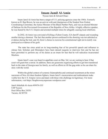 Imam Jamil Al-Amin has been a target of U.S. policing agencies since the 1960s. Formerly known as H. Rap Brown, he was an activist with and chairperson of the Student Non-Violent Coordinating Committee, the Justice Minister of the Black Panther Party, and was an elected Minister of Defense for the Provisional Government of the Republic of New Afrika. A highly effective speaker, he was feared by the U.S. Empire and arrested multiple times for allegedly causing local rebellions. In 2002, Al-Amin was convicted of killing a Fulton County, GA sheriff’s deputy and wounding another during a shootout. The fact that another person confessed to the shooting was not admitted as evidence during the trial; and Al-Amin’s choice to exercise his constitutional right not to testify was portrayed as evidence of his guilt. The state has since acted on its long-standing fear of his powerful speech and influence to silence him. Scholars and filmmakers have been denied requests to interview him and he has not been permitted to perform any of his duties as an imam for fear that he will radicalize incarcerated Muslims. Imam Jamil’s case was heard in appellate court on May 3rd; we are waiting to hear if that court will grant him a retrial. In addition, there are grassroots organizing efforts to get him transferred back to the state of Georgia near his family, as well as efforts to lift the gag order so he can share his story with the world. Within the global context of systemic Islamophobia and continued resentment at the minor successes of New Af-rikan freedom fighters, Imam Jamil’s incarceration and maltreatment make visible how the U.S. Empire views and deals with those who challenge its legitimacy. For more information, visit https://hrapbrownsymposium.wordpress.com/ Jamil Abdullah Al-Amin #99974-555 USP Tucson Post Office Box 24550 Tucson, AZ 85734