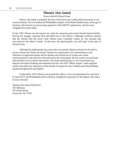Nyeusi Jami & Edward Onaci Mumia Abu Jamal is probably the most well-known and visible political prisoner in our current moment. He co-founded the Philadelphia chapter of the Black Panther party at the age of fourteen, later became an unwavering supporter of the MOVE organization, and has since struggled for human rights. In late 1982, Mumia was driving his taxi when he witnessed some police brutalizing his brother. During the struggle, someone shot and killed one of the officers. Although witnesses claimed that the shooter fled the scene while Mumia (also wounded) waited, he was arrested and convicted for the officer’s death. At that time, the death penalty was still legal in the state of Pennsylvania. Although his death penalty has since been overturned, Mumia continues to be held in prison without any chance for parole. Despite his incarceration, his commitments to the liberation of oppressed people and his fearless and skilled use of written and verbal communication to advocate for truth and justice have flourished. He has written several books and countless news columns and articles. His audio contributions to www.prisonradio.org educate and inspire budding and seasoned activists. His 2003 “Black August” audio segment clearly articulates the importance of the month of August for New Afrikans and African/Black people throughout the hemisphere. In December 2018, Mumia was granted the right to a new trial appealing his conviction. In April 2019, the Philadelphia district attorney dropped his opposition to the appeal, allowing it to move forward. Mumial Abu-Jamal #AM 8335 SCI Mahanoy 301 Morea Road Frackville, PA 17932