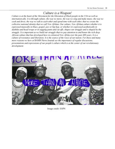 Culture is at the heart of the Movement for the liberation of Black people in the USA as well as internation-ally. It is through culture, the way we move, the way we sing and make music, the way we cook and dress, the way we talk to each other and spend time with each other, that we create the collective national identity that we call New Afrikan. Our culture, New Afrikan culture whether it is expressed musically in blues, gospel, jazz or hip hop, or whether it’s expressed aesthetically in dashikis and head wraps or in sagging pants and cut offs, shapes our struggle and is shaped by the struggle. It is important as we build our struggle that we pay attention to and honor the rich deep African culture that has developed here in colonized New Afrika over the past 400 years. It is a culture of resistance and liberation. It is the source of the voice of our nation. For these and many more reasons we here at BAMN News Journal see the importance of regular discussions, presentations and expressions of our people’s culture which is at the center of our revolutionary development.