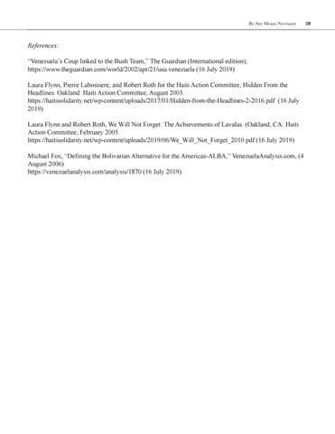 References: “Venezuela’s Coup linked to the Bush Team,” The Guardian (International edition), https://www.theguardian.com/world/2002/apr/21/usa.venezuela (16 July 2019) Laura Flynn, Pierre Labossiere, and Robert Roth for the Haiti Action Committee, Hidden From the Headlines. Oakland: Haiti Action Committee, August 2003. https://haitisolidarity.net/wp-content/uploads/2017/01/Hidden-from-the-Headlines-2-2016.pdf (16 July 2019) Laura Flynn and Robert Roth, We Will Not Forget: The Achievements of Lavalas. (Oakland, CA: Haiti Action Committee, February 2005. https://haitisolidarity.net/wp-content/uploads/2019/06/We_Will_Not_Forget_2010.pdf (16 July 2019) Michael Fox, “Defining the Bolivarian Alternative for the Americas-ALBA,” VenezuelaAnalysis.com, (4 August 2006) https://venezuelanalysis.com/analysis/1870 (16 July 2019)