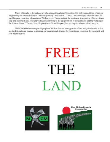 Many of the above formations are also urging the African Union (AU) to fully support their efforts in heightening the contradictions of “white supremacy” and racism. The AU has developed a role for the Afrikan Diaspora consisting of peoples of Afrikan origin “living outside the continent, irrespective of their citizenship and nationality and who are willing to contribute to the development of the continent and the building of the African Union.” The the Sixth Region (the Afrikan Diaspora) has yet to gain substantial AU support. NAPO/MXGM encourages all people of Afrikan descent to support its efforts and join them/us utilizing the International Decade to advance our international struggle for reparations, economic development, and self-determination.