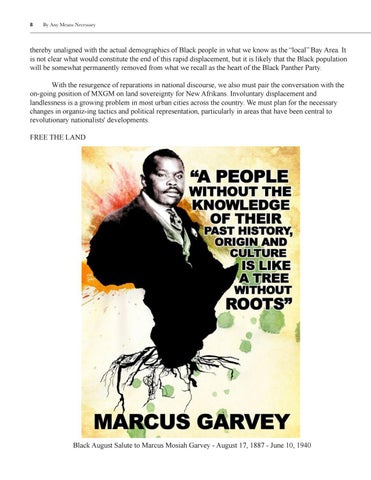 thereby unaligned with the actual demographics of Black people in what we know as the “local� Bay Area. It is not clear what would constitute the end of this rapid displacement, but it is likely that the Black population will be somewhat permanently removed from what we recall as the heart of the Black Panther Party. With the resurgence of reparations in national discourse, we also must pair the conversation with the on-going position of MXGM on land sovereignty for New Afrikans. Involuntary displacement and landlessness is a growing problem in most urban cities across the country. We must plan for the necessary changes in organiz-ing tactics and political representation, particularly in areas that have been central to revolutionary nationalists' developments. FREE THE LAND