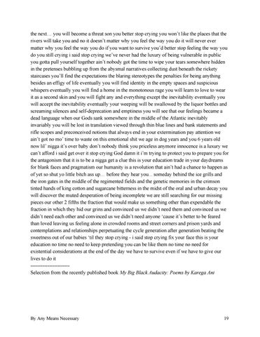 the next… you will become a threat son you better stop crying you won’t like the places that the rivers will take you and no it doesn’t matter why you feel the way you do it will never ever matter why you feel the way you do if you want to survive you’d better stop feeling the way you do you still crying i said stop crying we’ve never had the luxury of being vulnerable in public you gotta pull yourself together ain’t nobody got the time to wipe your tears somewhere hidden in the pretenses bubbling up from the abysmal narratives collecting dust beneath the rickety staircases you’ll find the expectations the blaring stereotypes the penalties for being anything besides an effigy of life eventually you will find identity in the empty spaces and suspicious whispers eventually you will find a home in the monotonous rage you will learn to love to wear it as a second skin and you will fight any and everything except the inevitability eventually you will accept the inevitability eventually your weeping will be swallowed by the liquor bottles and screaming silences and self-deprecation and emptiness you will see that our feelings became a dead language when our Gods sank somewhere in the middle of the Atlantic inevitably invariably you will be lost in translation viewed through thin blue lines and bank statements and rifle scopes and preconceived notions that always end in your extermination pay attention we ain’t got no mo’ time to waste on this emotional shit we age in dog years and you 6 years old now lil’ nigga it’s over baby don’t nobody think you priceless anymore innocence is a luxury we can’t afford i said get over it stop crying God damn it i’m trying to protect you to prepare you for the antagonism that it is to be a nigga get a clue this is your education trade in your daydreams for blank faces and pragmatism our humanity is a revolution that ain’t had a chance to happen as of yet so shut yo little bitch ass up… before they hear you... someday behind the ice grills and the iron gates in the middle of the regimented fields and the genetic memories in the crimson tinted hands of king cotton and sugarcane bitterness in the midst of the oral and urban decay you will discover the muted desperation of being incomplete we are still searching for our missing pieces our other 2 fifths the fraction that would make us something other than expendable the fraction in which they hid our grins and convinced us we didn’t need them and convinced us we didn’t need each other and convinced us we didn’t need anyone ‘cause it’s better to be feared than loved leaving us feeling alone in crowded rooms and street corners and prison yards and contemplations and relationships perpetuating the cycle generation after generation beating the sweetness out of our babies ‘til they stop crying - i said stop crying fix your face this is your education no time no need to keep pretending you can be like them no time no need for existential considerations at the end of the day we have to survive even if we have to give our lives to do it ----------------------Selection from the recently published book My Big Black Audacity: Poems by Karega Ani