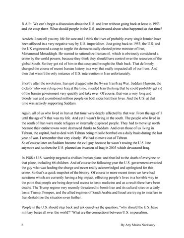R.A.P.: We can’t begin a discussion about the U.S. and Iran without going back at least to 1953 and the coup there. What should people in the U.S. understand about what happened at that time? Azadeh: I can tell you my life for sure and I think the lives of probably every single Iranian have been affected in a very negative way by U.S. imperialism. Just going back to 1953, the U.S. and the UK engineered a coup to topple the democratically elected prime minister of Iran, Mohammad Mosaddegh. He wanted to nationalize Iranian oil, which is obviously considered a crime by the world powers, because they think they should have control over the resources of the global South. So they got rid of him in that coup and brought the Shah back. That definitely changed the course of recent Iranian history in a way that really impacted all of our lives. And then that wasn’t the only instance of U.S. intervention in Iran unfortunately. Shortly after the revolution, Iran got dragged into the 8-year Iran/Iraq War. Saddam Hussein, the dictator who was ruling over Iraq at the time, invaded Iran thinking that he could probably get rid of the Iranian government very quickly and take over. Of course, that was a very long and bloody war and a combined million people on both sides lost their lives. And the U.S. at that time was actively supporting Saddam. Again, all of us who lived in Iran at that time were deeply affected by that war. From the age of 1 until the age of 9 that was my life. And yet I wasn’t living in the south. The people who lived in the south of Iran were made refugees or internally displaced people. They had to move up north because their entire towns were destroyed thanks to Saddam. And even those of us living in Tehran, the capitol, had to deal with Tehran being missile bombed on a daily basis during the last year of war. I remember that very clearly. We had to move out of Tehran. So of course later on Saddam became the evil guy because he wasn’t towing the U.S. line anymore and so then the U.S. planned an invasion of Iraq in 2003 which devastated Iraq. In 1988 a U.S. warship targeted a civilian Iranian plane, and that led to the death of everyone on that plane, including 66 children. And of course the following year the U.S. government awarded the guy who was leading the charge and never really acknowledged and apologized for this crime. So that’s a quick snapshot of the history. Of course in more recent times we have had sanctions which are currently having a big impact, effecting people’s lives in a horrible way to the point that people are being deprived access to basic medicine and as a result there have been deaths. The Trump regime very recently threatened to bomb Iran and its cultural sites on a daily basis. Trump, Pompeo, and the allied regimes of Saudi Arabia and Israel are trying to interfere in Iran destabilize the situation even further. People in the U.S. should step back and ask ourselves the question, “why should the U.S. have military bases all over the world?” What are the connections between U.S. imperialism, 6