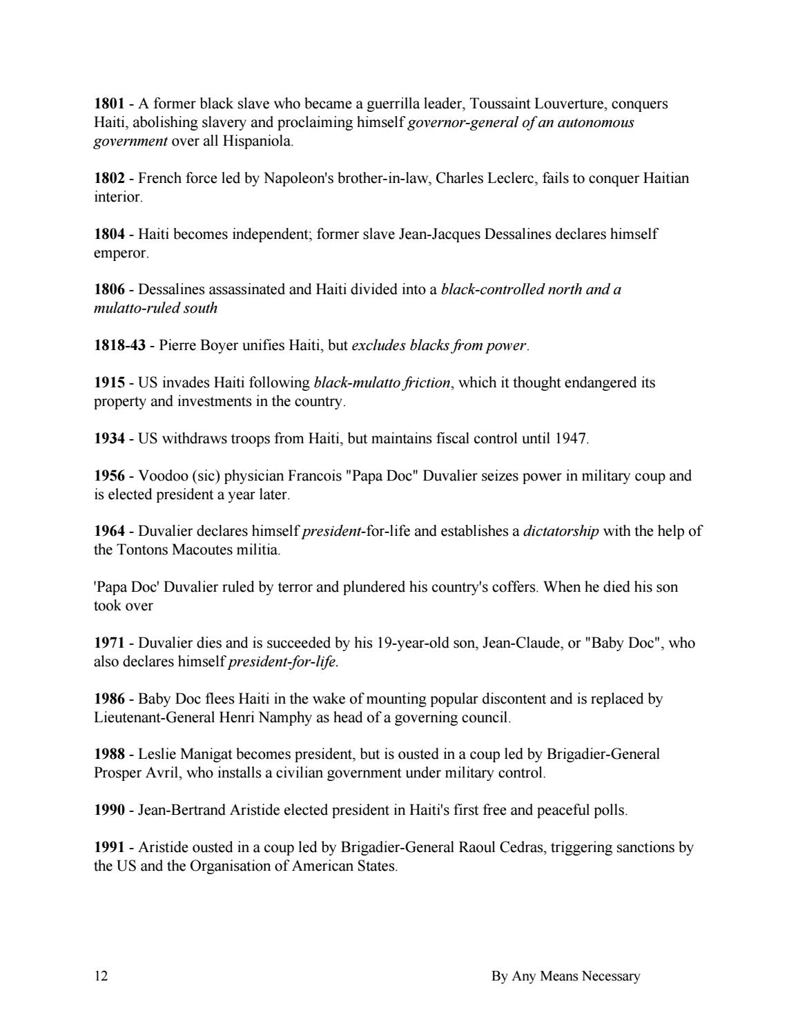 1801 - A former black slave who became a guerrilla leader, Toussaint Louverture, conquers Haiti, abolishing slavery and proclaiming himself governor-general of an autonomous government o ver all Hispaniola. 1802 - French force led by Napoleon's brother-in-law, Charles Leclerc, fails to conquer Haitian interior. 1804 - Haiti becomes independent; former slave Jean-Jacques Dessalines declares himself emperor. 1806 - Dessalines assassinated and Haiti divided into a black-controlled north and a mulatto-ruled south 1818-43 - Pierre Boyer unifies Haiti, but excludes blacks from power. 1915 - US invades Haiti following black-mulatto friction, which it thought endangered its property and investments in the country. 1934 - US withdraws troops from Haiti, but maintains fiscal control until 1947. 1956 - Voodoo (sic) physician Francois "Papa Doc" Duvalier seizes power in military coup and is elected president a year later. 1964 - Duvalier declares himself president-for-life and establishes a dictatorship with the help of the Tontons Macoutes militia. 'Papa Doc' Duvalier ruled by terror and plundered his country's coffers. When he died his son took over 1971 - Duvalier dies and is succeeded by his 19-year-old son, Jean-Claude, or "Baby Doc", who also declares himself president-for-life. 1986 - Baby Doc flees Haiti in the wake of mounting popular discontent and is replaced by Lieutenant-General Henri Namphy as head of a governing council. 1988 - Leslie Manigat becomes president, but is ousted in a coup led by Brigadier-General Prosper Avril, who installs a civilian government under military control. 1990 - Jean-Bertrand Aristide elected president in Haiti's first free and peaceful polls. 1991 - Aristide ousted in a coup led by Brigadier-General Raoul Cedras, triggering sanctions by the US and the Organisation of American States.