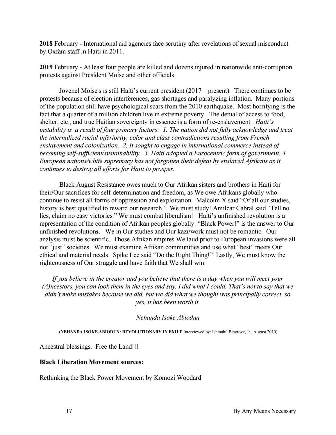 2018 February - International aid agencies face scrutiny after revelations of sexual misconduct by Oxfam staff in Haiti in 2011. 2019 February - At least four people are killed and dozens injured in nationwide anti-corruption protests against President Moise and other officials. Jovenel Moise's is still Haiti’s current president (2017 – present). There continues to be protests because of election interferences, gas shortages and paralyzing inflation. Many portions of the population still have psychological scars from the 2010 earthquake. Most horrifying is the fact that a quarter of a million children live in extreme poverty. The denial of access to food, shelter, etc., and true Haitian sovereignty in essence is a form of re-enslavement. Haiti’s instability is a result of four primary factors: 1. The nation did not fully acknowledge and treat the internalized racial inferiority, color and class contradictions resulting from French enslavement and colonization. 2. It sought to engage in international commerce instead of becoming self-sufficient/sustainability. 3. Haiti adopted a Eurocentric form of government. 4. European nations/white supremacy has not forgotten their defeat by enslaved Afrikans as it continues to destroy all efforts for Haiti to prosper. Black August Resistance owes much to Our Afrikan sisters and brothers in Haiti for their/Our sacrifices for self-determination and freedom, as We owe Afrikans globally who continue to resist all forms of oppression and exploitation. Malcolm X said “Of all our studies, history is best qualified to reward our research.” We must study! Amilcar Cabral said “Tell no lies, claim no easy victories.” We must combat liberalism! Haiti’s unfinished revolution is a representation of the condition of Afrikan peoples globally. “Black Power!” is the answer to Our unfinished revolutions. We in Our studies and Our kazi/work must not be romantic. Our analysis must be scientific. Those Afrikan empires We laud prior to European invasions were all not “just” societies. We must examine Afrikan communities and use what “best” meets Our ethical and material needs. Spike Lee said “Do the Right Thing!” Lastly, We must know the righteousness of Our struggle and have faith that We shall win. If you believe in the creator and you believe that there is a day when you will meet your (A)ncestors, you can look them in the eyes and say, I did what I could. That’s not to say that we didn’t make mistakes because we did, but we did what we thought was principally correct, so yes, it has been worth it. Nehanda Isoke Abiodun (NEHANDA ISOKE ABIODUN: REVOLUTIONARY IN EXILE Interviewed by: Ishmahil Blagrove, Jr., August 2010)