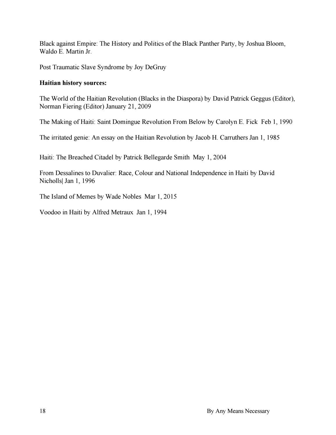 Black against Empire: The History and Politics of the Black Panther Party, by Joshua Bloom, Waldo E. Martin Jr. Post Traumatic Slave Syndrome by Joy DeGruy Haitian history sources: The World of the Haitian Revolution (Blacks in the Diaspora) by David Patrick Geggus (Editor), Norman Fiering (Editor) January 21, 2009 The Making of Haiti: Saint Domingue Revolution From Below by Carolyn E. Fick Feb 1, 1990 The irritated genie: An essay on the Haitian Revolution by Jacob H. Carruthers Jan 1, 1985 Haiti: The Breached Citadel by Patrick Bellegarde Smith May 1, 2004 From Dessalines to Duvalier: Race, Colour and National Independence in Haiti by David Nicholls| Jan 1, 1996 The Island of Memes by Wade Nobles Mar 1, 2015 Voodoo in Haiti by Alfred Metraux Jan 1, 1994