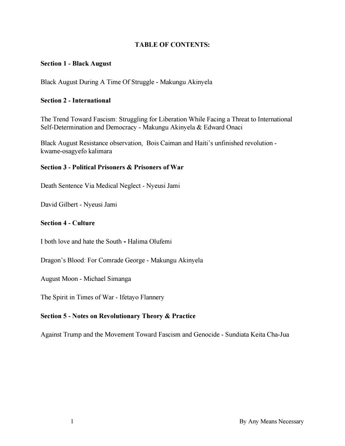 TABLE OF CONTENTS: Section 1 - Black August Black August During A Time Of Struggle - Makungu Akinyela Section 2 - International The Trend Toward Fascism: Struggling for Liberation While Facing a Threat to International Self-Determination and Democracy - Makungu Akinyela & Edward Onaci Black August Resistance observation, Bois Caiman and Haiti’s unfinished revolution kwame-osagyefo kalimara Section 3 - Political Prisoners & Prisoners of War Death Sentence Via Medical Neglect - Nyeusi Jami David Gilbert - Nyeusi Jami Section 4 - Culture I both love and hate the South - Halima Olufemi Dragon’s Blood: For Comrade George - Makungu Akinyela August Moon - Michael Simanga The Spirit in Times of War - Ifetayo Flannery Section 5 - Notes on Revolutionary Theory & Practice Against Trump and the Movement Toward Fascism and Genocide - Sundiata Keita Cha-Jua