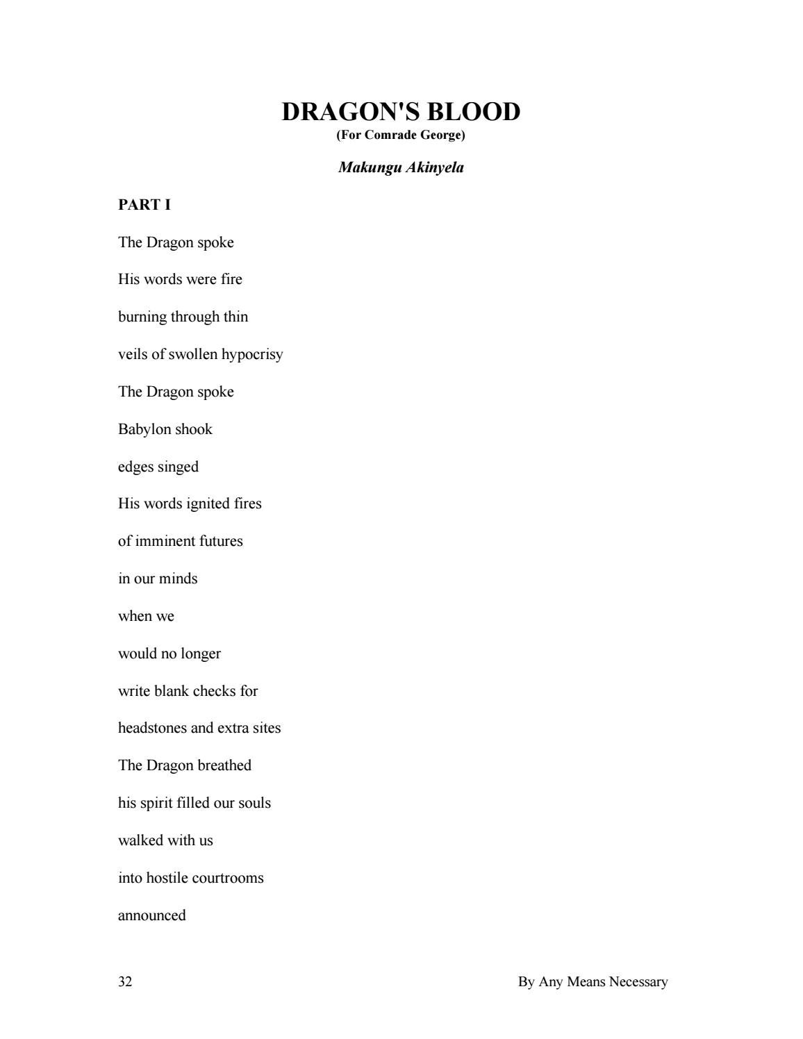 Makungu Akinyela PART I The Dragon spoke His words were fire burning through thin veils of swollen hypocrisy The Dragon spoke Babylon shook edges singed His words ignited fires of imminent futures in our minds when we would no longer write blank checks for headstones and extra sites The Dragon breathed his spirit filled our souls walked with us into hostile courtrooms announced