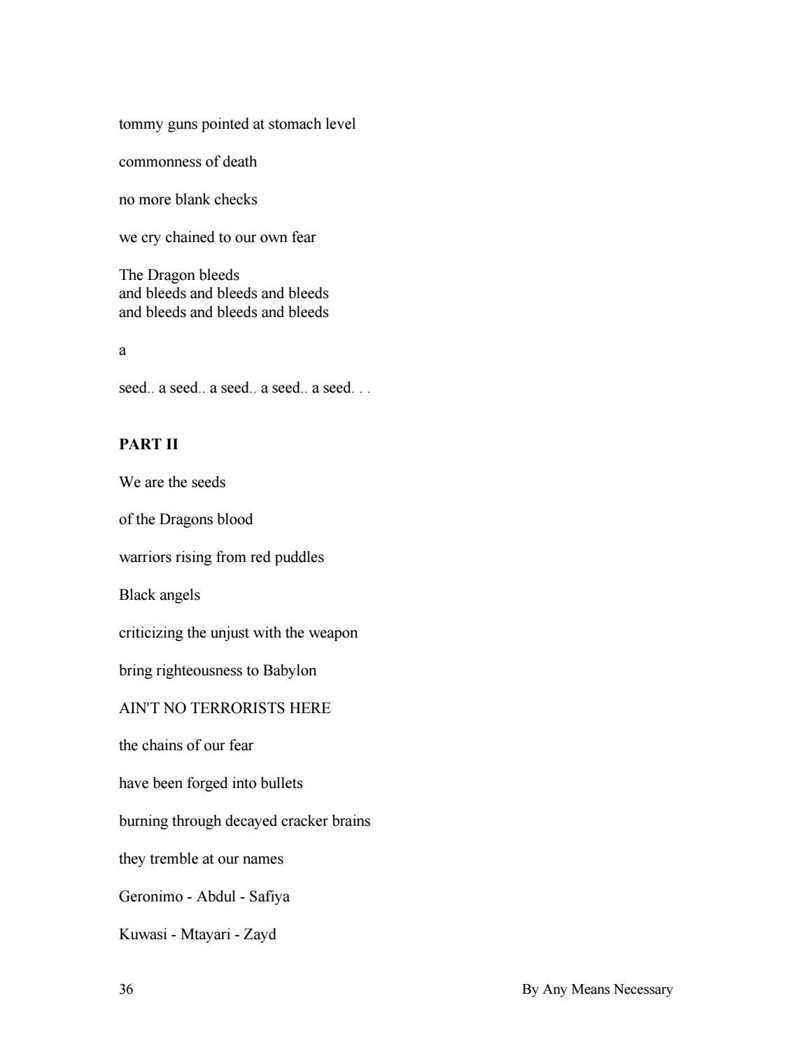 tommy guns pointed at stomach level commonness of death no more blank checks we cry chained to our own fear The Dragon bleeds and bleeds and bleeds and bleeds and bleeds and bleeds and bleeds a seed.. a seed.. a seed.. a seed.. a seed. . . PART II We are the seeds of the Dragons blood warriors rising from red puddles Black angels criticizing the unjust with the weapon bring righteousness to Babylon AIN'T NO TERRORISTS HERE the chains of our fear have been forged into bullets burning through decayed cracker brains they tremble at our names Geronimo - Abdul - Safiya Kuwasi - Mtayari - Zayd 36