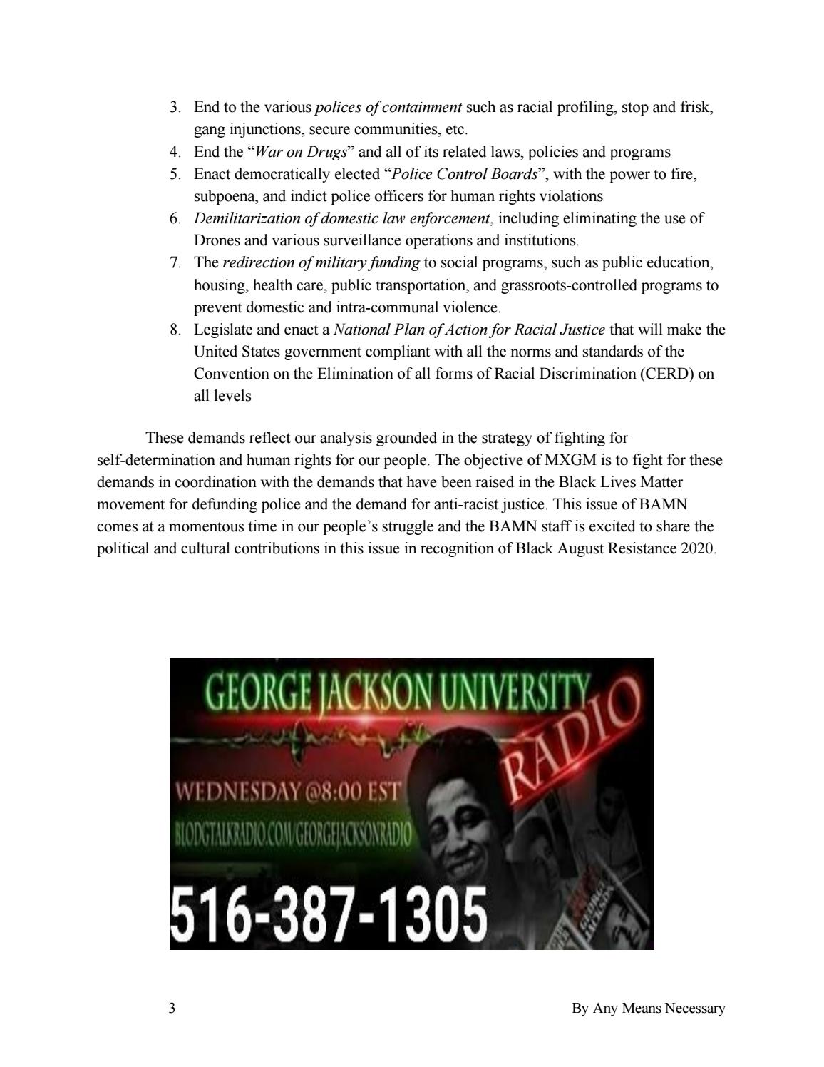 3. End to the various polices of containment such as racial profiling, stop and frisk, gang injunctions, secure communities, etc. 4. End the “War on Drugs” and all of its related laws, policies and programs 5. Enact democratically elected “Police Control Boards” , with the power to fire, subpoena, and indict police officers for human rights violations 6. Demilitarization of domestic law enforcement, including eliminating the use of Drones and various surveillance operations and institutions. 7. The redirection of military funding to social programs, such as public education, housing, health care, public transportation, and grassroots-controlled programs to prevent domestic and intra-communal violence. 8. Legislate and enact a National Plan of Action for Racial Justice that will make the United States government compliant with all the norms and standards of the Convention on the Elimination of all forms of Racial Discrimination (CERD) on all levels These demands reflect our analysis grounded in the strategy of fighting for self-determination and human rights for our people. The objective of MXGM is to fight for these demands in coordination with the demands that have been raised in the Black Lives Matter movement for defunding police and the demand for anti-racist justice. This issue of BAMN comes at a momentous time in our people’s struggle and the BAMN staff is excited to share the political and cultural contributions in this issue in recognition of Black August Resistance 2020.