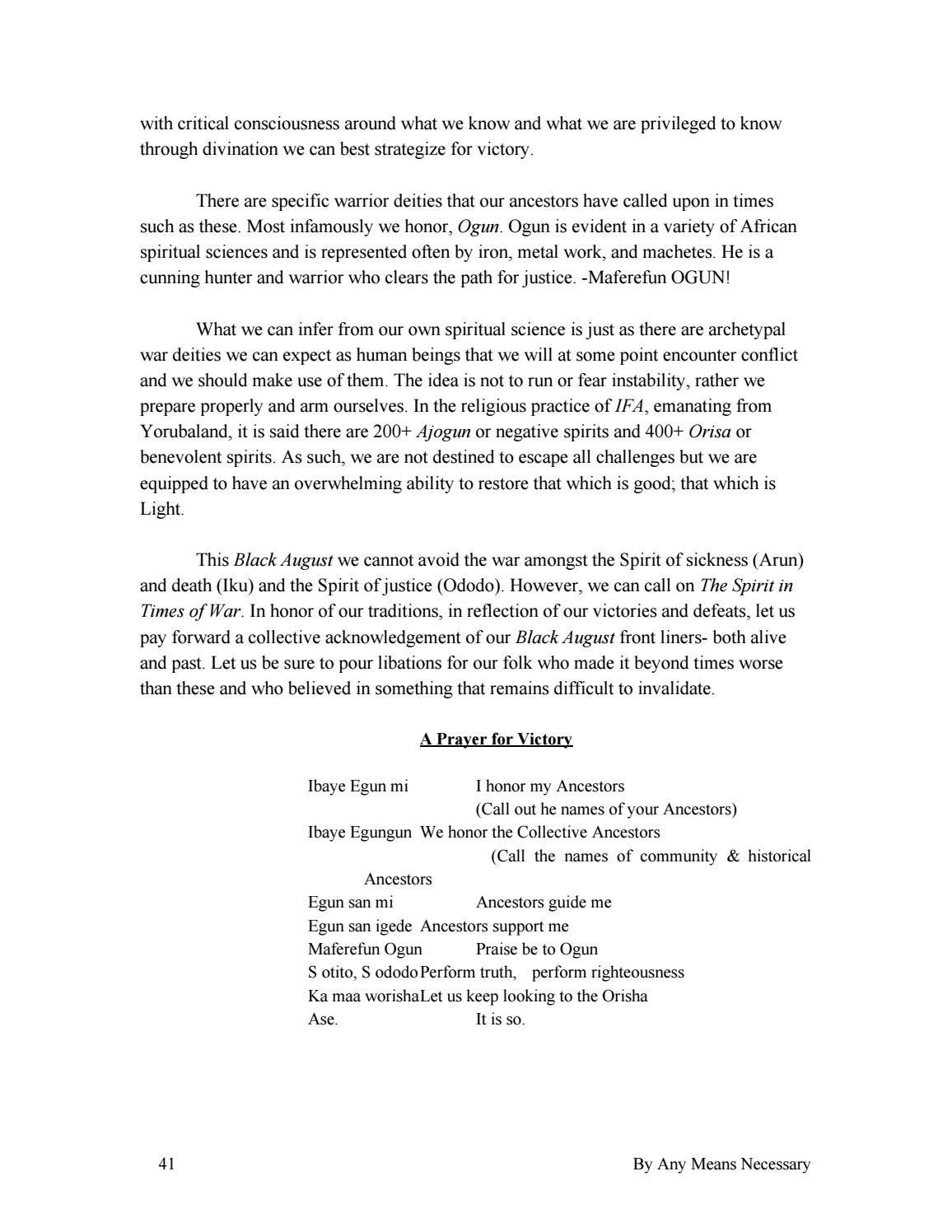 with critical consciousness around what we know and what we are privileged to know through divination we can best strategize for victory. There are specific warrior deities that our ancestors have called upon in times such as these. Most infamously we honor, Ogun. Ogun is evident in a variety of African spiritual sciences and is represented often by iron, metal work, and machetes. He is a cunning hunter and warrior who clears the path for justice. -Maferefun OGUN! What we can infer from our own spiritual science is just as there are archetypal war deities we can expect as human beings that we will at some point encounter conflict and we should make use of them. The idea is not to run or fear instability, rather we prepare properly and arm ourselves. In the religious practice of IFA, emanating from Yorubaland, it is said there are 200+ Ajogun o r negative spirits and 400+ Orisa or benevolent spirits. As such, we are not destined to escape all challenges but we are equipped to have an overwhelming ability to restore that which is good; that which is Light. This Black August we cannot avoid the war amongst the Spirit of sickness (Arun) and death (Iku) and the Spirit of justice (Ododo). However, we can call on The Spirit in Times of War. In honor of our traditions, in reflection of our victories and defeats, let us pay forward a collective acknowledgement of our Black August front liners- both alive and past. Let us be sure to pour libations for our folk who made it beyond times worse than these and who believed in something that remains difficult to invalidate. A Prayer for Victory Ibaye Egun mi