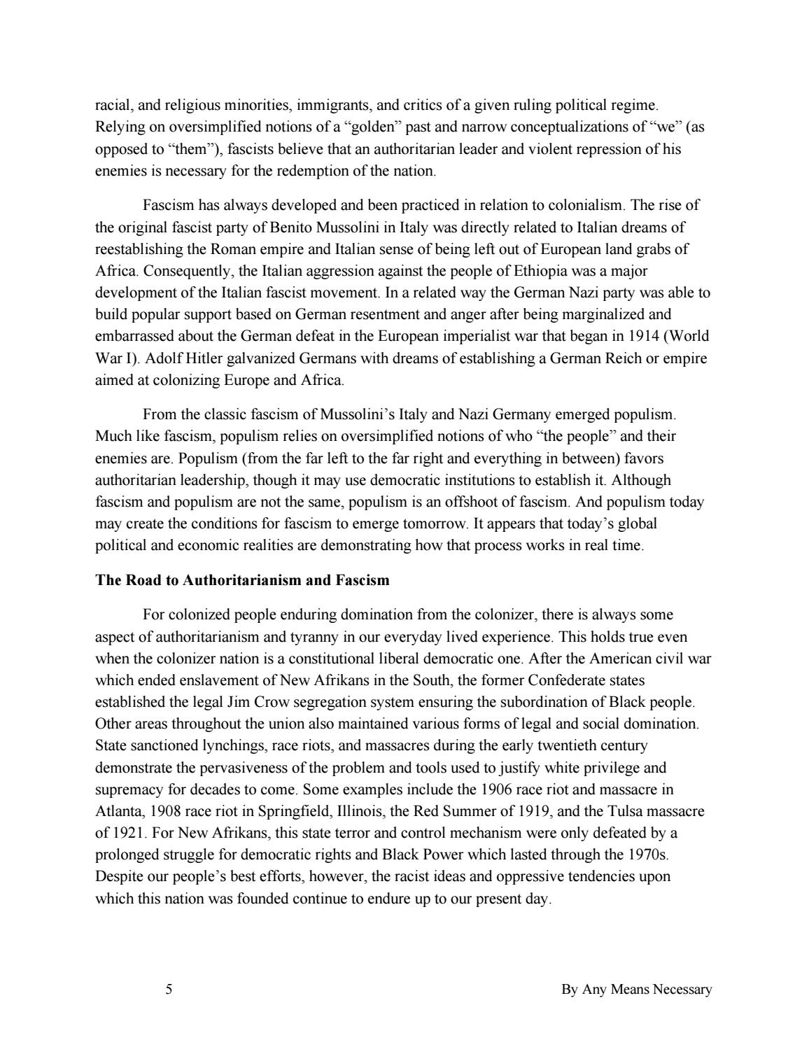 racial, and religious minorities, immigrants, and critics of a given ruling political regime. Relying on oversimplified notions of a “golden” past and narrow conceptualizations of “we” (as opposed to “them”), fascists believe that an authoritarian leader and violent repression of his enemies is necessary for the redemption of the nation. Fascism has always developed and been practiced in relation to colonialism. The rise of the original fascist party of Benito Mussolini in Italy was directly related to Italian dreams of reestablishing the Roman empire and Italian sense of being left out of European land grabs of Africa. Consequently, the Italian aggression against the people of Ethiopia was a major development of the Italian fascist movement. In a related way the German Nazi party was able to build popular support based on German resentment and anger after being marginalized and embarrassed about the German defeat in the European imperialist war that began in 1914 (World War I). Adolf Hitler galvanized Germans with dreams of establishing a German Reich or empire aimed at colonizing Europe and Africa. From the classic fascism of Mussolini’s Italy and Nazi Germany emerged populism. Much like fascism, populism relies on oversimplified notions of who “the people” and their enemies are. Populism (from the far left to the far right and everything in between) favors authoritarian leadership, though it may use democratic institutions to establish it. Although fascism and populism are not the same, populism is an offshoot of fascism. And populism today may create the conditions for fascism to emerge tomorrow. It appears that today’s global political and economic realities are demonstrating how that process works in real time. The Road to Authoritarianism and Fascism For colonized people enduring domination from the colonizer, there is always some aspect of authoritarianism and tyranny in our everyday lived experience. This holds true even when the colonizer nation is a constitutional liberal democratic one. After the American civil war which ended enslavement of New Afrikans in the South, the former Confederate states established the legal Jim Crow segregation system ensuring the subordination of Black people. Other areas throughout the union also maintained various forms of legal and social domination. State sanctioned lynchings, race riots, and massacres during the early twentieth century demonstrate the pervasiveness of the problem and tools used to justify white privilege and supremacy for decades to come. Some examples include the 1906 race riot and massacre in Atlanta, 1908 race riot in Springfield, Illinois, the Red Summer of 1919, and the Tulsa massacre of 1921. For New Afrikans, this state terror and control mechanism were only defeated by a prolonged struggle for democratic rights and Black Power which lasted through the 1970s. Despite our people’s best efforts, however, the racist ideas and oppressive tendencies upon which this nation was founded continue to endure up to our present day.