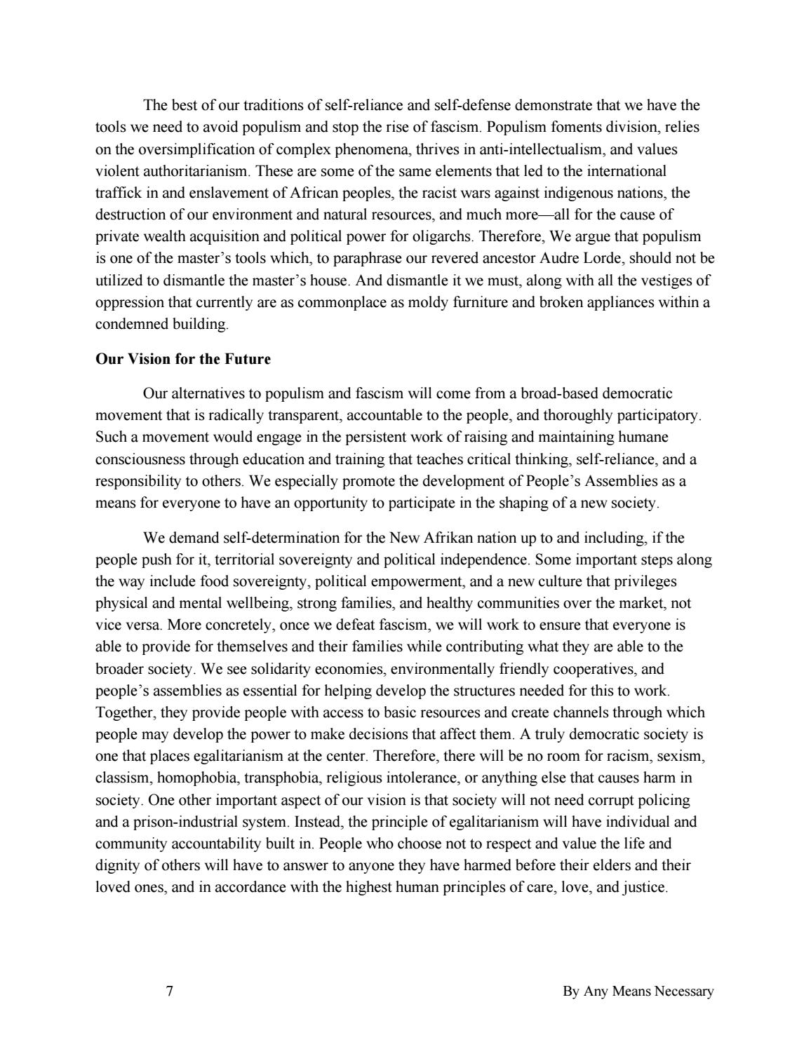 The best of our traditions of self-reliance and self-defense demonstrate that we have the tools we need to avoid populism and stop the rise of fascism. Populism foments division, relies on the oversimplification of complex phenomena, thrives in anti-intellectualism, and values violent authoritarianism. These are some of the same elements that led to the international traffick in and enslavement of African peoples, the racist wars against indigenous nations, the destruction of our environment and natural resources, and much more—all for the cause of private wealth acquisition and political power for oligarchs. Therefore, We argue that populism is one of the master’s tools which, to paraphrase our revered ancestor Audre Lorde, should not be utilized to dismantle the master’s house. And dismantle it we must, along with all the vestiges of oppression that currently are as commonplace as moldy furniture and broken appliances within a condemned building. Our Vision for the Future Our alternatives to populism and fascism will come from a broad-based democratic movement that is radically transparent, accountable to the people, and thoroughly participatory. Such a movement would engage in the persistent work of raising and maintaining humane consciousness through education and training that teaches critical thinking, self-reliance, and a responsibility to others. We especially promote the development of People’s Assemblies as a means for everyone to have an opportunity to participate in the shaping of a new society. We demand self-determination for the New Afrikan nation up to and including, if the people push for it, territorial sovereignty and political independence. Some important steps along the way include food sovereignty, political empowerment, and a new culture that privileges physical and mental wellbeing, strong families, and healthy communities over the market, not vice versa. More concretely, once we defeat fascism, we will work to ensure that everyone is able to provide for themselves and their families while contributing what they are able to the broader society. We see solidarity economies, environmentally friendly cooperatives, and people’s assemblies as essential for helping develop the structures needed for this to work. Together, they provide people with access to basic resources and create channels through which people may develop the power to make decisions that affect them. A truly democratic society is one that places egalitarianism at the center. Therefore, there will be no room for racism, sexism, classism, homophobia, transphobia, religious intolerance, or anything else that causes harm in society. One other important aspect of our vision is that society will not need corrupt policing and a prison-industrial system. Instead, the principle of egalitarianism will have individual and community accountability built in. People who choose not to respect and value the life and dignity of others will have to answer to anyone they have harmed before their elders and their loved ones, and in accordance with the highest human principles of care, love, and justice.
