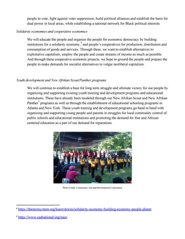 people to vote, fight against voter suppression, build political alliances and establish the basis for dual power in local areas, while establishing a national network for Black political interests. Solidarity economies and cooperative economics We will educate the people and organize the people for economic democracy by building 8 institutions for a solidarity economy, and people’s cooperatives for production, distribution and consumption of goods and services. Through these, we want to establish alternatives to exploitative capitalism, employ the people and create streams of income as much as possible. And through these cooperative economic projects, we hope to ground the people and prepare the people to make demands for socialist alternatives to vulgar neoliberal capitalism.